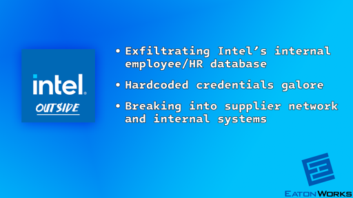arrow-up15arrow-down1external-linkIntel Outside: Hacking every Intel employee and various internal websitesplus-squareeaton-works.comArthur Besse@lemmy.mlEnglish · 3 months agomessage-square0linkfedilink