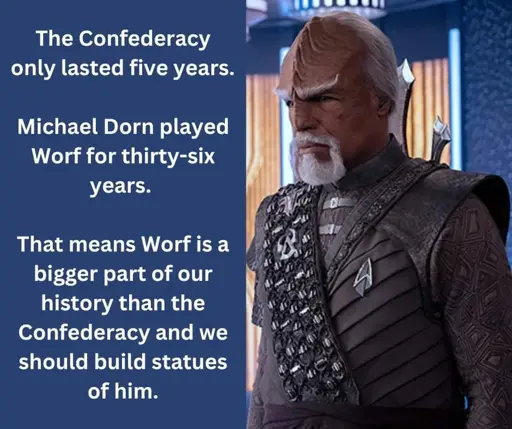 arrow-up1563arrow-down1imageWORF STATUES NOW, IT'S LITERALLY OUR HERITAGElemmy.worldPugJesus@lemmy.world to TenForward: Where Every Vulcan Knows Your Name@lemmy.worldEnglish · 2 months agomessage-square46linkfedilinkcross-posted to: shermanposting@lemmy.world