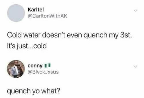 SnokenKeekaGuard@lemmy.dbzer0.com to Hydro Homies@lemmy.mlEnglish · 1 year agoBro will spell quench but saying thirst is too hardlemmy.dbzer0.comimagemessage-square20linkfedilinkarrow-up1181arrow-down15
