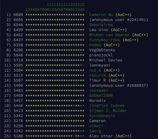 Congrats to everyone! Not first year, though first year of at least trying every problem. Burnout definitely got me by day 20 though, ha ha ha… There was a lot of ugly (readability a backseat to “code writing speed”), a lot of bad (don’t ask how long the test suite has to run for), but an occasional gem of good (my day 19 solution is some of the most dopamine from just writing code I’ve gotten. I’m only used to getting that much when it actually gets merged). I learned a little through the problems themselves, but I did learn a lot about writing