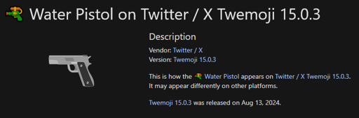 Apple and Xitter should keep what they currently have. Microsoft and Google should switch back to their 2013 versions because they were awesome. Facebook should also switch back to its 2013 emoji, but in that case because the revolver was the previously most common one and its the basic bitch of social media. Samsung should switch to an emoji of either that improvised gun the guy who shot Shinzo Abe used, or some ridiculous anime weapon.