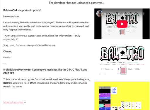 Balatro for the C64 is planned to be an official release, including a physical version by PleasureBytes Games. I have already contacted the original developer (Localthunk) and publisher (Playstack).