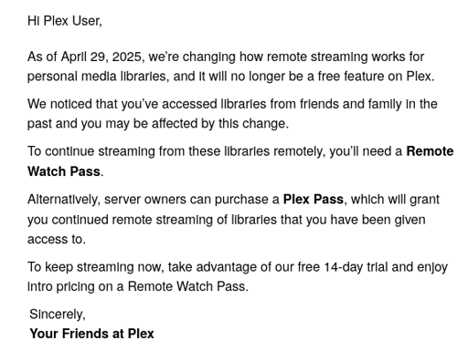 What I find shitty about this is that it’s being indiscriminately sent to every Plex account. There’s bound to be lots of people who don’t understand what this means who will be tricked into buying a streaming pass they don’t need at all. I’ve been getting messages from my users all day asking wtf is going on, and I’m getting tired of trying to convince them to just ignore the email.