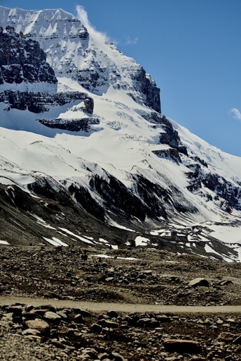 Crumbling snowpack spans the outflow of the Athabasca Glacier, which may be seen in the background. Small from distance, the vehicles that drive up to the glacier may also be seen along with their tracks.