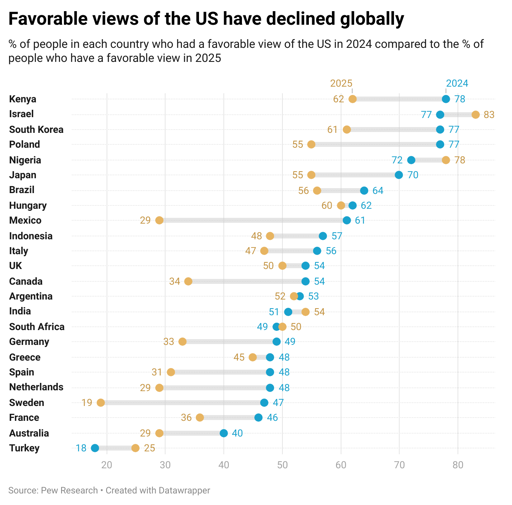 Stolen from R*ddit: https://www.reddit.com/r/dataisbeautiful/comments/1l9ij5z/oc_favorable_views_of_the_us_have_declined/
