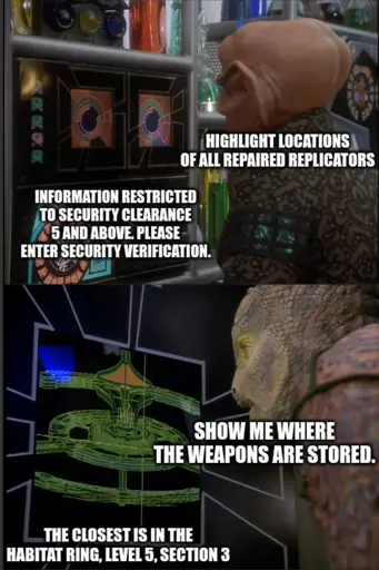 Iced Raktajino@startrek.website to Risa@startrek.websiteEnglish · 2 months agoCardassian Security Prioritiesstartrek.websiteimagemessage-square15linkfedilinkarrow-up1145arrow-down10file-text