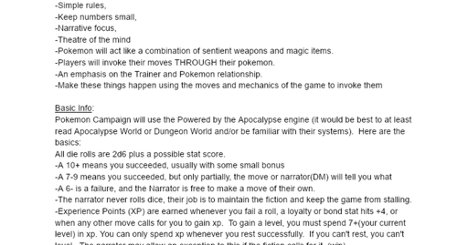 For those interested, here is a Pokemon ttrpg that tries not to be as crunchy as other systems I’ve seen out there. Instead, it uses PbtA to make the game feel more like the manga/anime. I doubt I’ll ever finish this, so feel free to take what is here and use it/tweak it for your table. If you do post an updated version, I just ask you reference us and send a link so I can see your handy work!