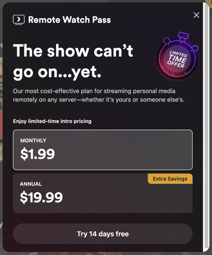 Right, the $2 is to use the relay service, which costs Plex bandwidth. They can’t just do it free for everyone forever, bandwidth costs money.