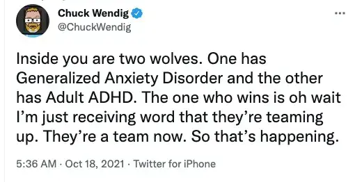 I have ADHD, anxiety, bipolar depression, insomnia; and although I understand sarcasm, I’ve suspected for years that I may have autism as well. Is that enough wolves?