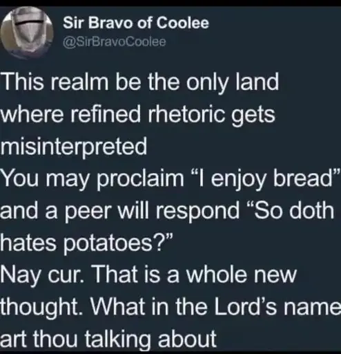 minus-squareCaptain Aggravated@sh.itjust.workslinkfedilinkEnglisharrow-up6·1 month agoThouest dothest hatest potatoeseth?