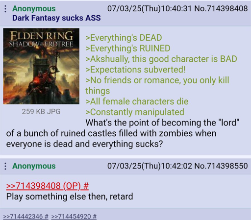 arrow-up1388arrow-down1imageAnon hates dark fantasysh.itjust.works🍹Early to RISA 🧉@sh.itjust.worksM to Greentext@sh.itjust.works · 1 month agomessage-square41linkfedilink